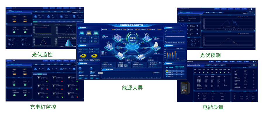 能量管理系統包含微電網光伏、充電樁及總體負荷情況,體現系統主接線圖、光伏信息、充電樁信息、告警信息、收益、環境等。