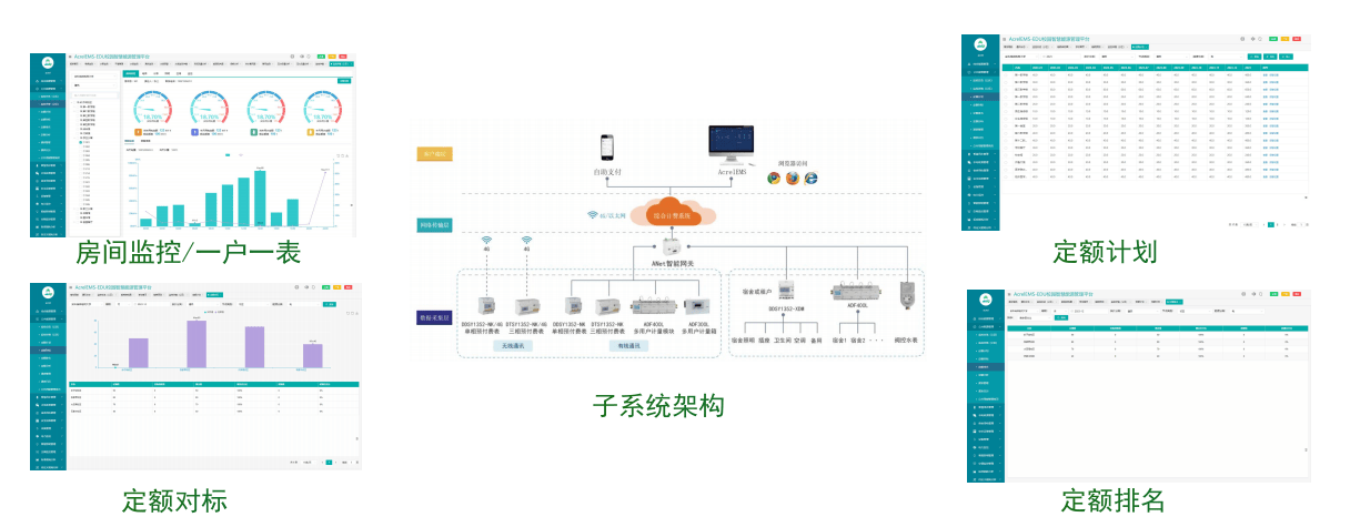 校針對教學、辦公等公共區域用能進行檢測和管理。以房間為單位對水電用能進行統計、并對照明和空調用能進行策略管控;以組織拓撲或空間(建筑)拓撲為基準對能耗進行統計分析,進行指標下發、定額對標、定額排名、超額報警等功能。